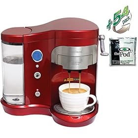 This review is from: SunCafe Coffee Pod Brewer H701A - Red (includes 54 World Blend Regular Pods)Terrific coffee maker! This is my third in about two months -- my quest to replace a Senseo Supreme -- see my previous review of the Bunn for further account of my tribulations.Cutting to the bottom line: I still think I prefer the Senseo Supreme, but this is certainly a worthy alternate. The only reason I did not go with a new Senseo is that a LOT of recent reviews complained about a very bad plastic smell/taste, and associated this with a new manufacturer in the last year.Comparison to Senseo: General: Good high pressure, high temp brew. Reservoir, not pour as you go. Gives the same nice foamy top as the Senseo. Better: Accepts a bigger variety of pod sizes/brands without complaint. The Senseo could be a little finicky about non-Senseo pods. Gives the pod a short "opening blast" to prime it before the full cup.Not better: Only accepts one pod at a time; I miss being able to do an extra-large or extra-strong cup all at one go. A lot fewer size (volume) options than Senseo. I think it's noticeably noisier than the Senseo. The cup bay is a bit awkwardly-shaped; a couple of my cups with large or low-set handles don't fit quite neatly. The top looks like it is flat, but isn't: you want to set the pod tray on top when you're working with it and it slides off! (Learning curve here!)All in all, a great little machine. From what I hear of the current Senseo, it may be the better choice in the price range, or even the best. Either way, you will not be disappointed....