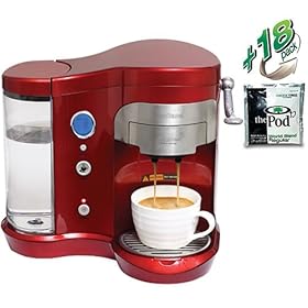 This review is from: SunCafe Coffee Pod Brewer H701A - Red (includes 18 World Blend Regular Pods)Terrific coffee maker! This is my third in about two months -- my quest to replace a Senseo Supreme -- see my previous review of the Bunn for further account of my tribulations.Cutting to the bottom line: I still think I prefer the Senseo Supreme, but this is certainly a worthy alternate. The only reason I did not go with a new Senseo is that a LOT of recent reviews complained about a very bad plastic smell/taste, and associated this with a new manufacturer in the last year.Comparison to Senseo: General: Good high pressure, high temp brew. Reservoir, not pour as you go. Gives the same nice foamy top as the Senseo. Better: Accepts a bigger variety of pod sizes/brands without complaint. The Senseo could be a little finicky about non-Senseo pods. Gives the pod a short "opening blast" to prime it before the full cup.Not better: Only accepts one pod at a time; I miss being able to do an extra-large or extra-strong cup all at one go. A lot fewer size (volume) options than Senseo. I think it's noticeably noisier than the Senseo. The cup bay is a bit awkwardly-shaped; a couple of my cups with large or low-set handles don't fit quite neatly. The top looks like it is flat, but isn't: you want to set the pod tray on top when you're working with it and it slides off! (Learning curve here!)All in all, a great little machine. From what I hear of the current Senseo, it may be the better choice in the price range, or even the best. Either way, you will not be disappointed....